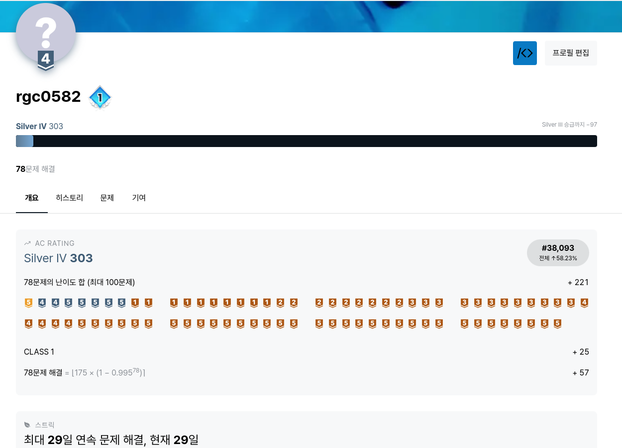 알고리즘을 학습하다가 몇문제를 풀어보니 실버4로 승급했다.