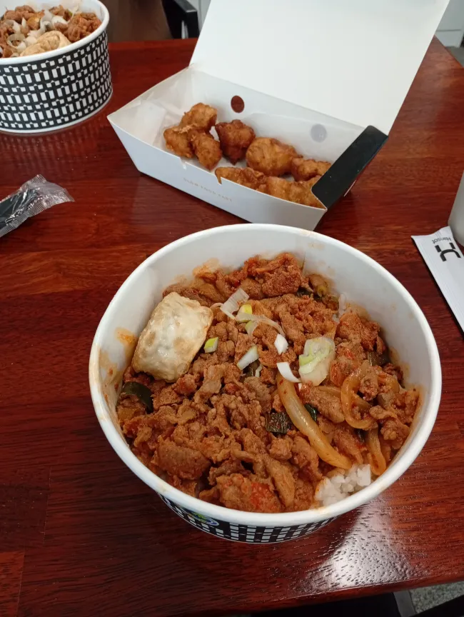 점심은 한솥에서 제육이랑 가라아게 그리고 튀김만두를 먹었는데