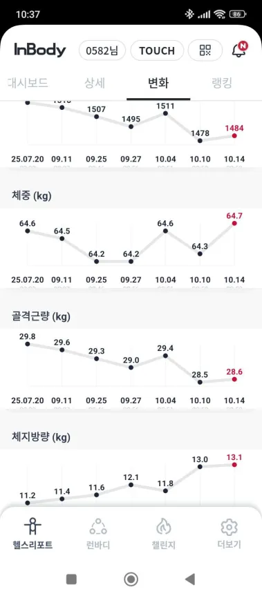 체수분이 적게 잡혔는데 체수분이 없으면 나머지가 다 체지방으로 잡히는 것 아닌가 의심되긴 했다.