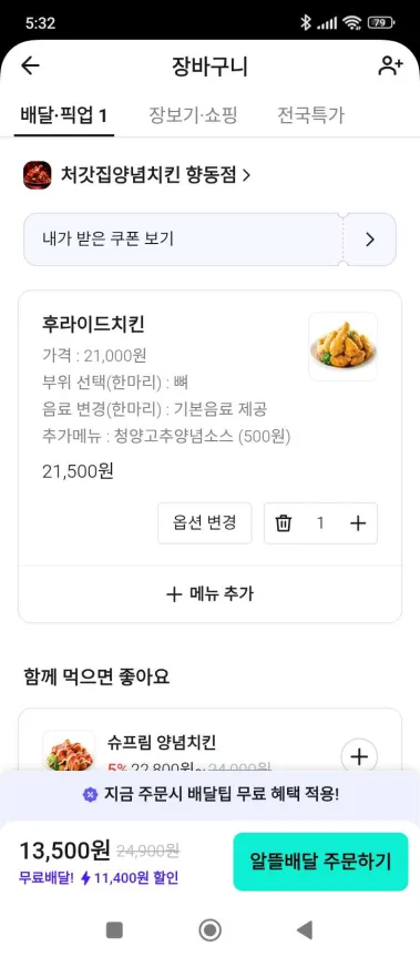 지금 자기엔 너무 빠르기도 하고 해먹긴 힘들어서 마침 할인하는 치킨을 주문해봤다.