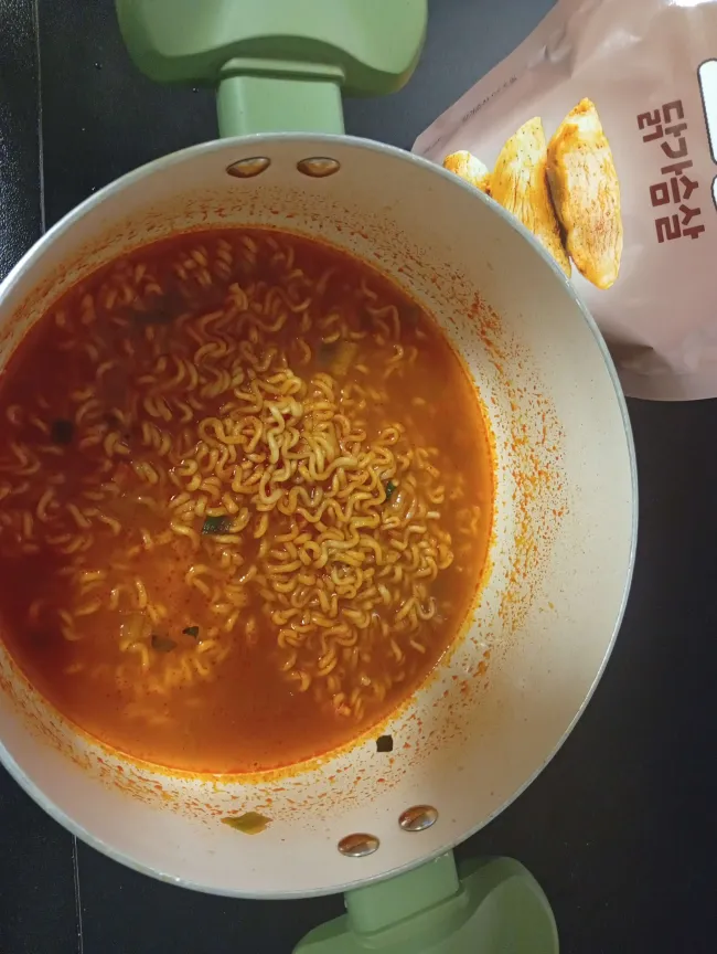 라면에 간단하게 닭가슴살을 데워 먹었는데