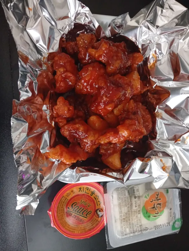 시장에서 13000원에 닭강정을 사와서 점심 겸 저녁으로 나눠 먹었는데