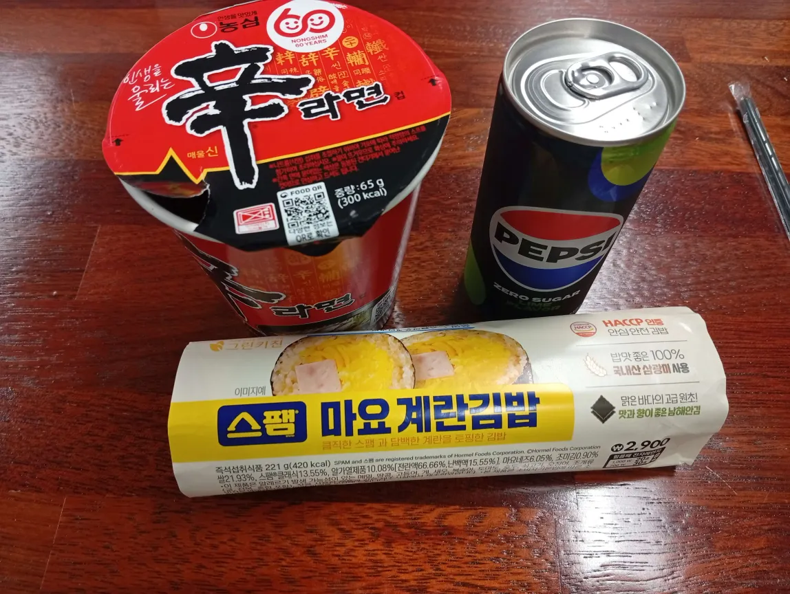 그냥 간단하게 편의점에서 김밥을 사서 회사에 있는 라면, 콜라랑 같이 먹었다.