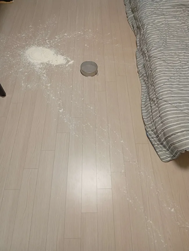 잠깐 분리수거 하고 오려고 옆에 세워뒀다가 남은 밀가루가 엎어져버려서 집이 난장판이 되어버렸다.