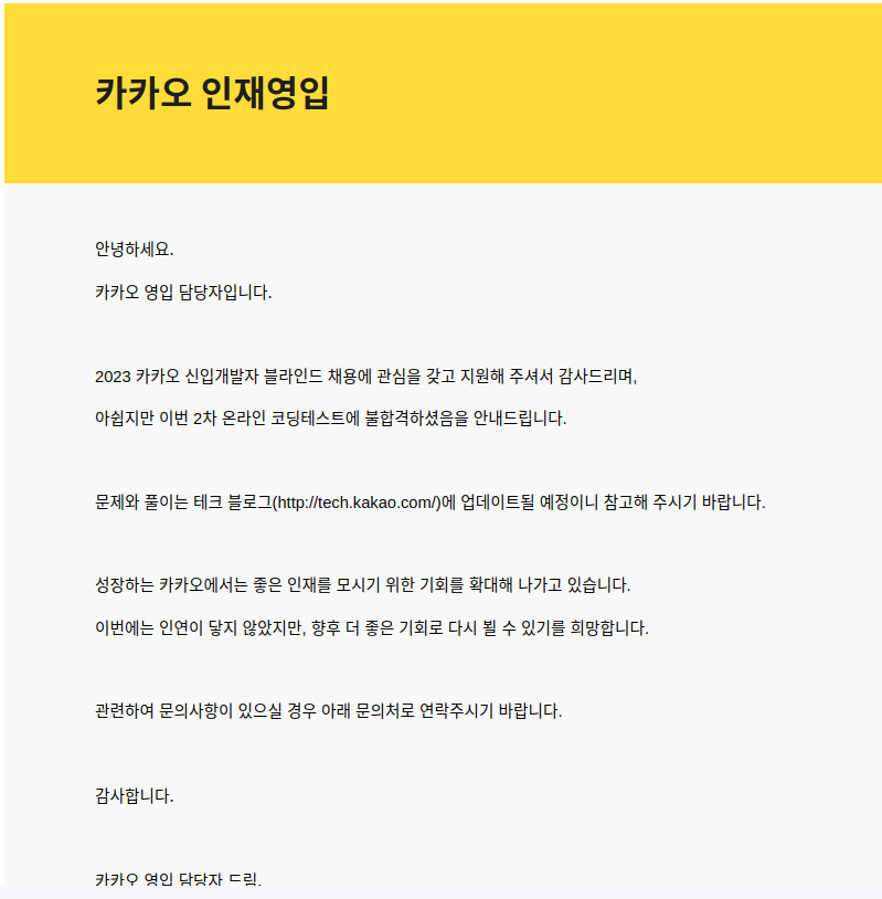 안타깝게도 카카오 2차는 불합격 통지를 받았다.