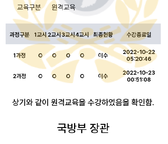 예비군 8강의라고 생각하고 쉽게 봤는데 내부에 4개정도의 강의들이 들어있어 8시간정도 걸렸다.