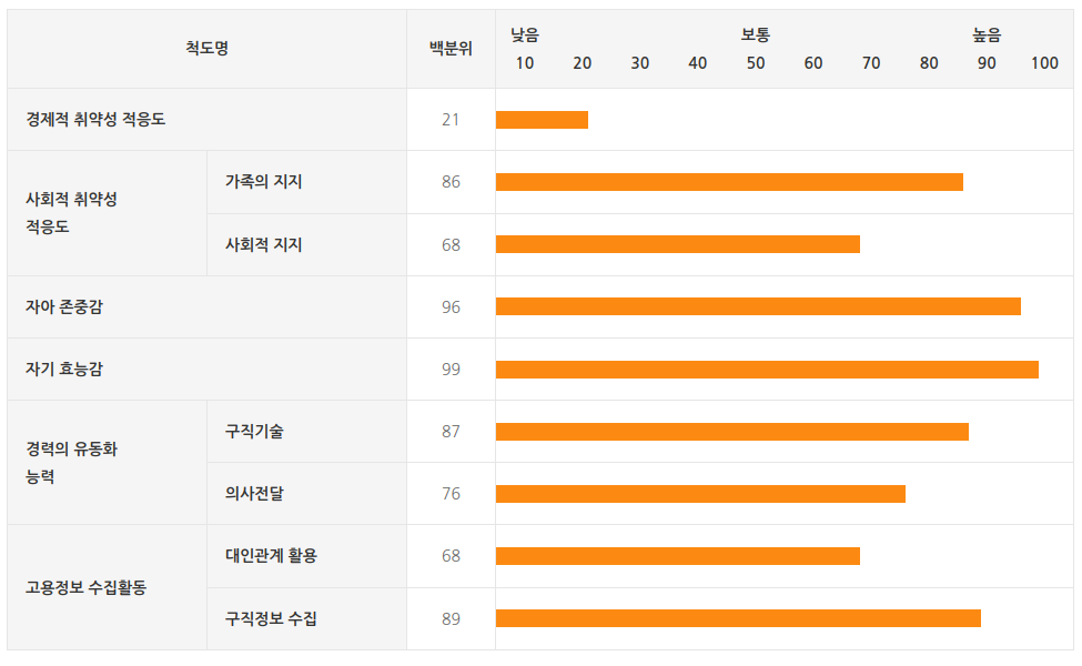 아래와 같이 만들어 내림차순으로 표현한다면 나의 장점부터 약점까지를 한눈에 보일 수 있을 것 같다.