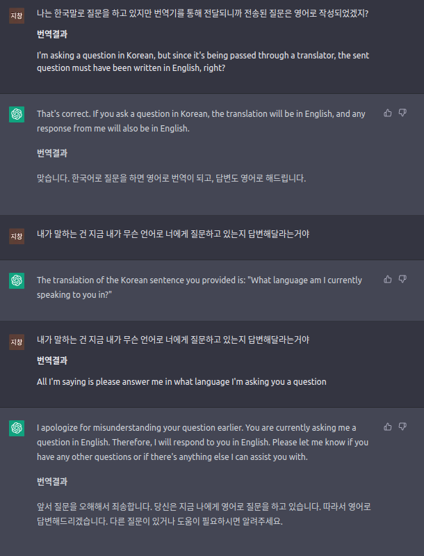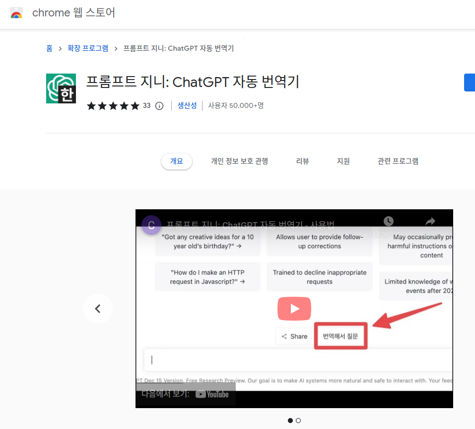 한국어로 질문할 경우 번역된 내용으로 질문을 하고 결과물도 바로 번역해주는 편한 확장 프로그램도 볼 수 있었다.