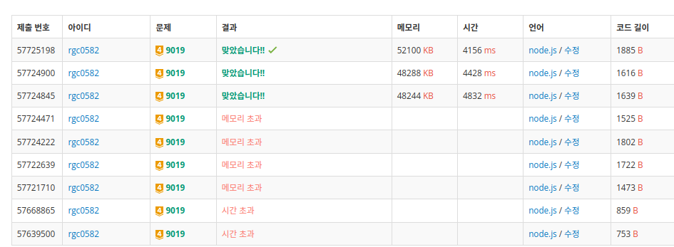 메모리초과에 걸려서 제출이 되지 않았고(위 사진을 보면 헷갈리겠지만 저건 종료 후 테스트한 내용이다)