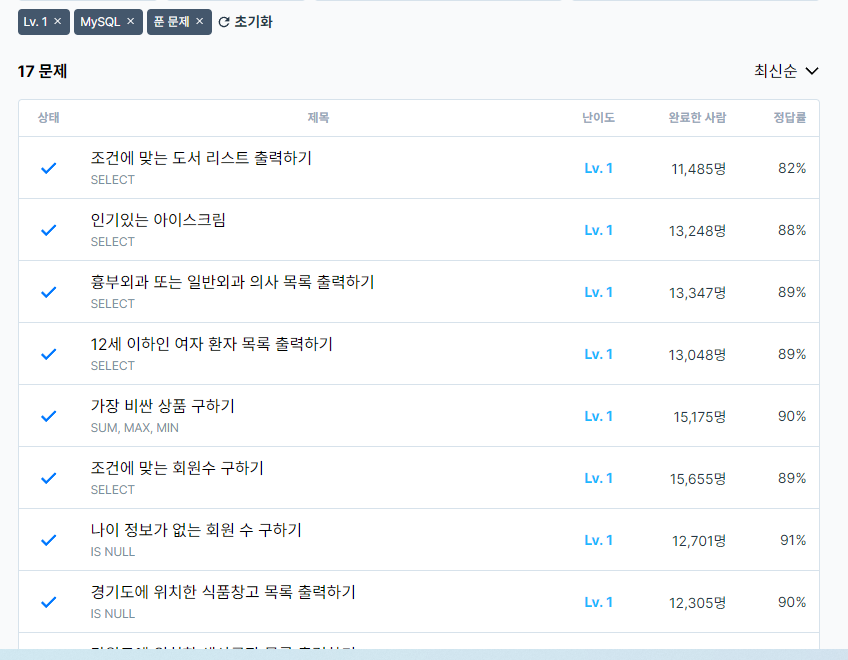 그냥 프로그래머스의 sql 문제를 쉬운 것 부터 차근차근 풀기로 했다.
