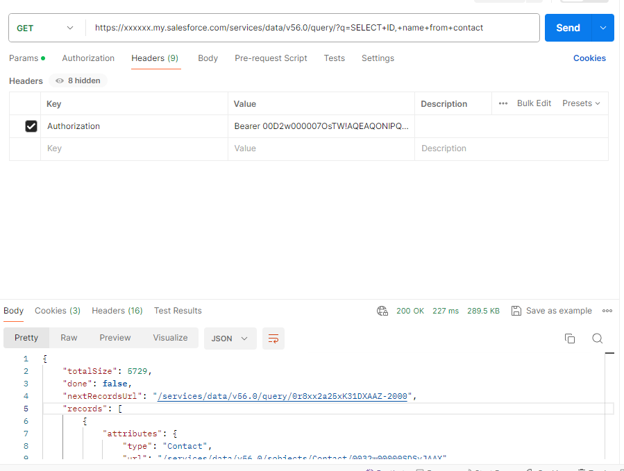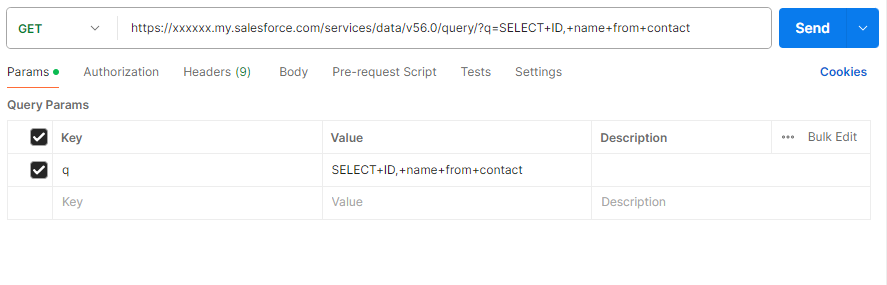 위에서 나온 instance_url 뒤에 services/data/v56.0/query/?q= + 쿼리문을 넣어 직접 sfdc 레코드 쿼리가 가능하다.