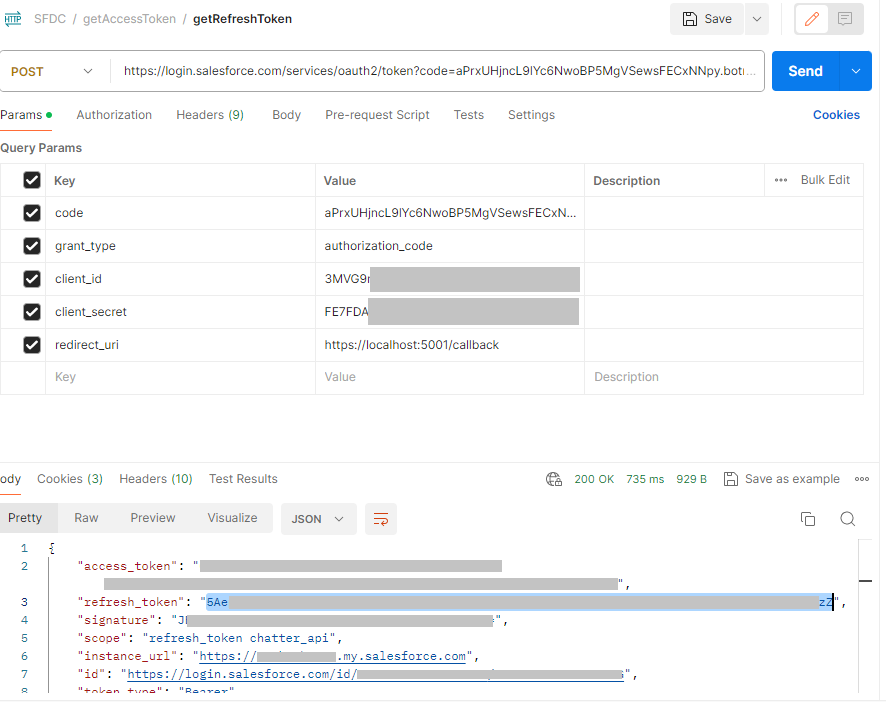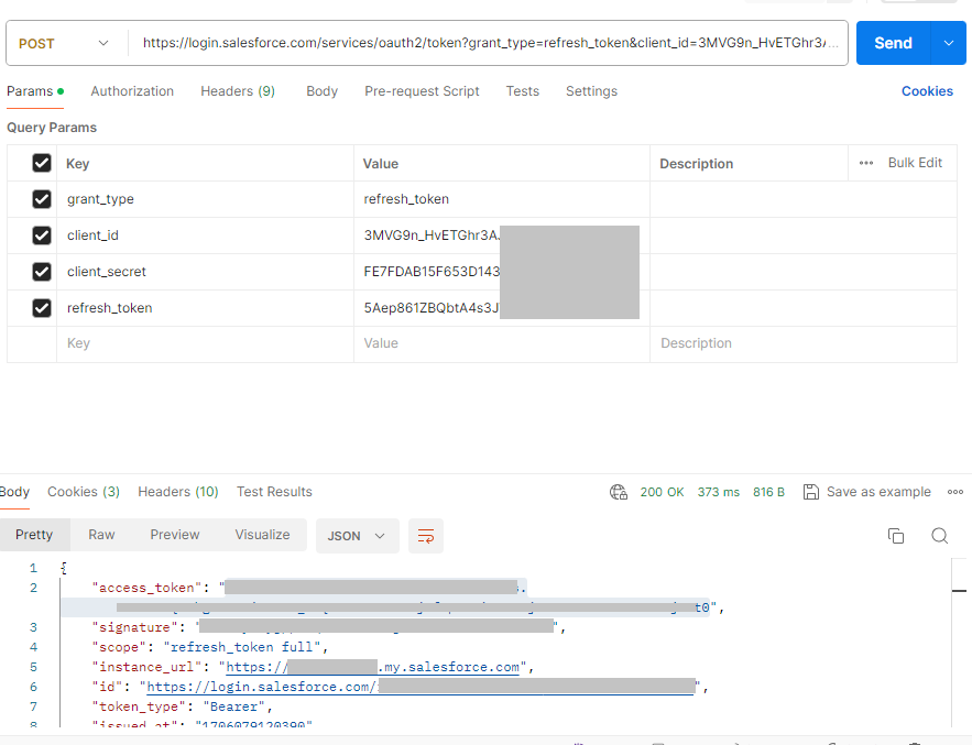 이제 refresh을 발급받아야 하는데 아래와 같이 https://login.salesforce.com/services/oauth2/token 주소값에 code, grant_type, client_id, client_secret, redirect_uri을 Params로 넣어주면 되고