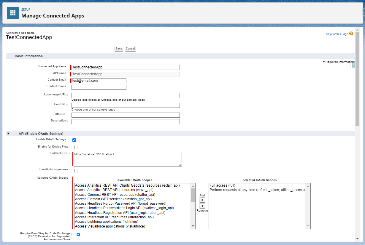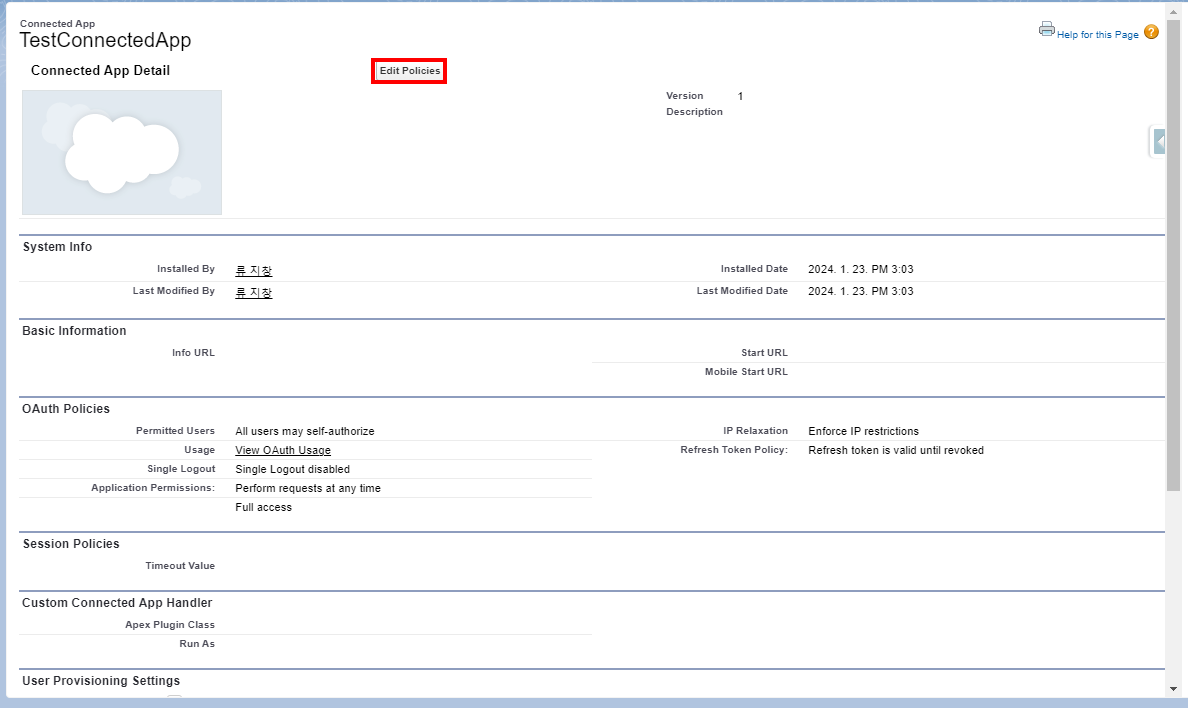 Connected App의 LastModified에서 10분이 지나지 않았다면 잠깐 쉬거나 다음 내용을 미리 확인하는 것을 추천한다.