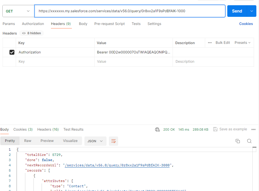 최대 출력 갯수는 2천개로 제한되어 있기 때문에 두번째 사진처럼 nextRecordsUrl을 사용해 다음 값을 받을 수 있다.